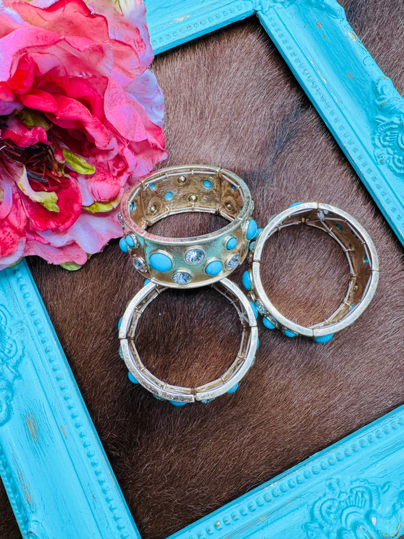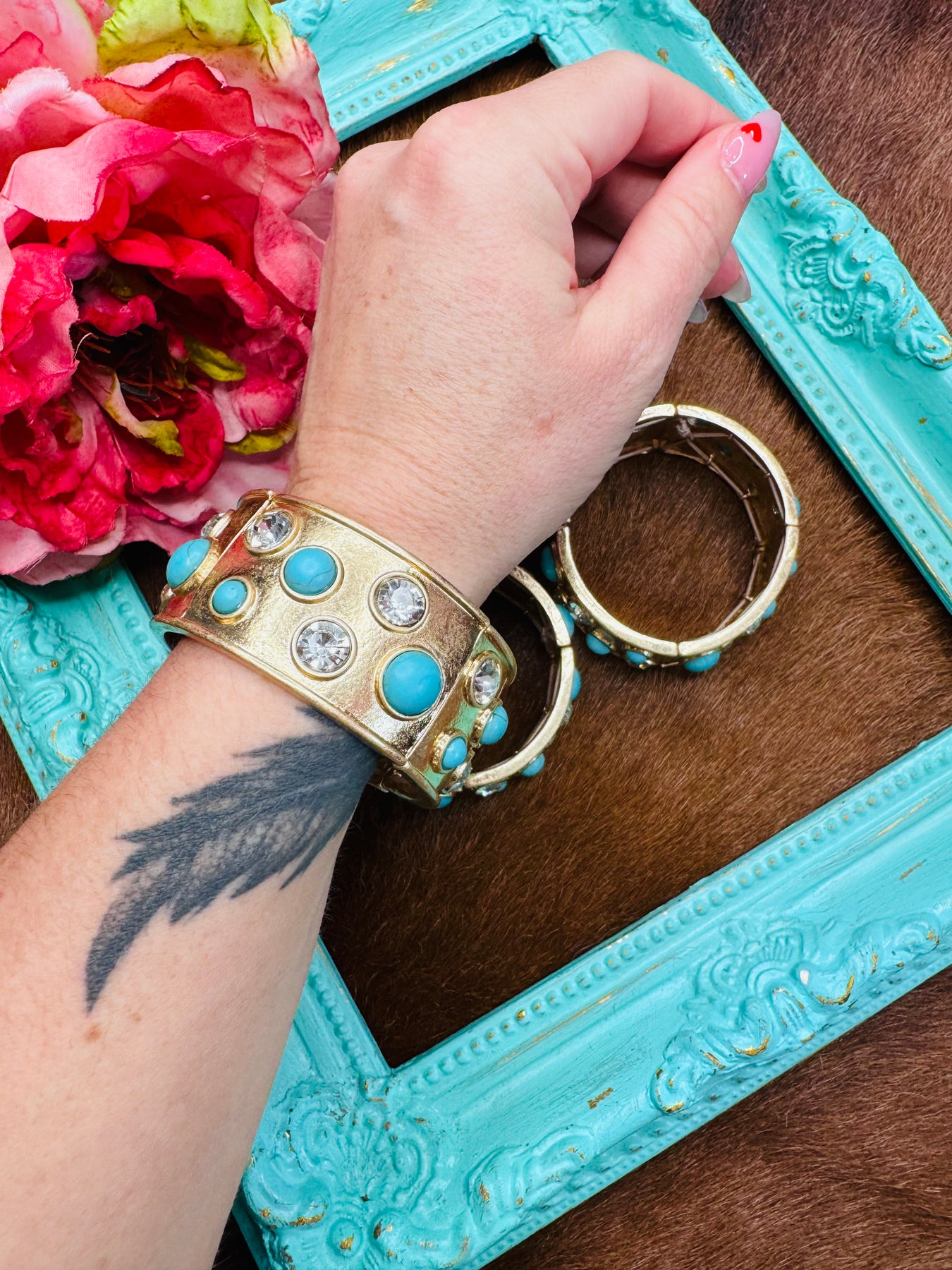 Turquoise, Crystal, and Gold Stretch Bracelet