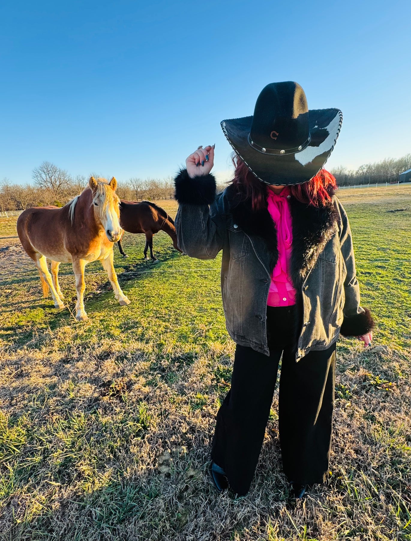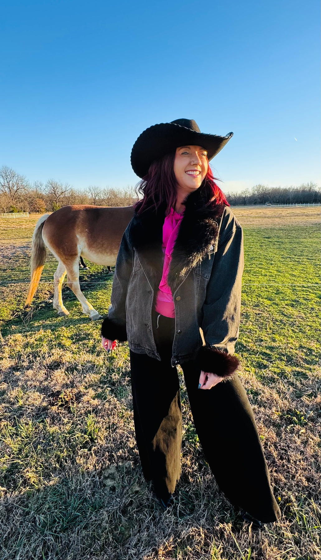 Washed Black Fur Collar and Cuff Oversized Denim Jacket