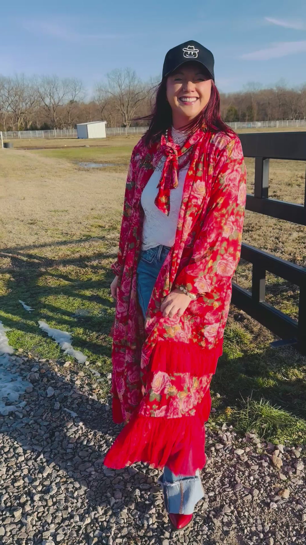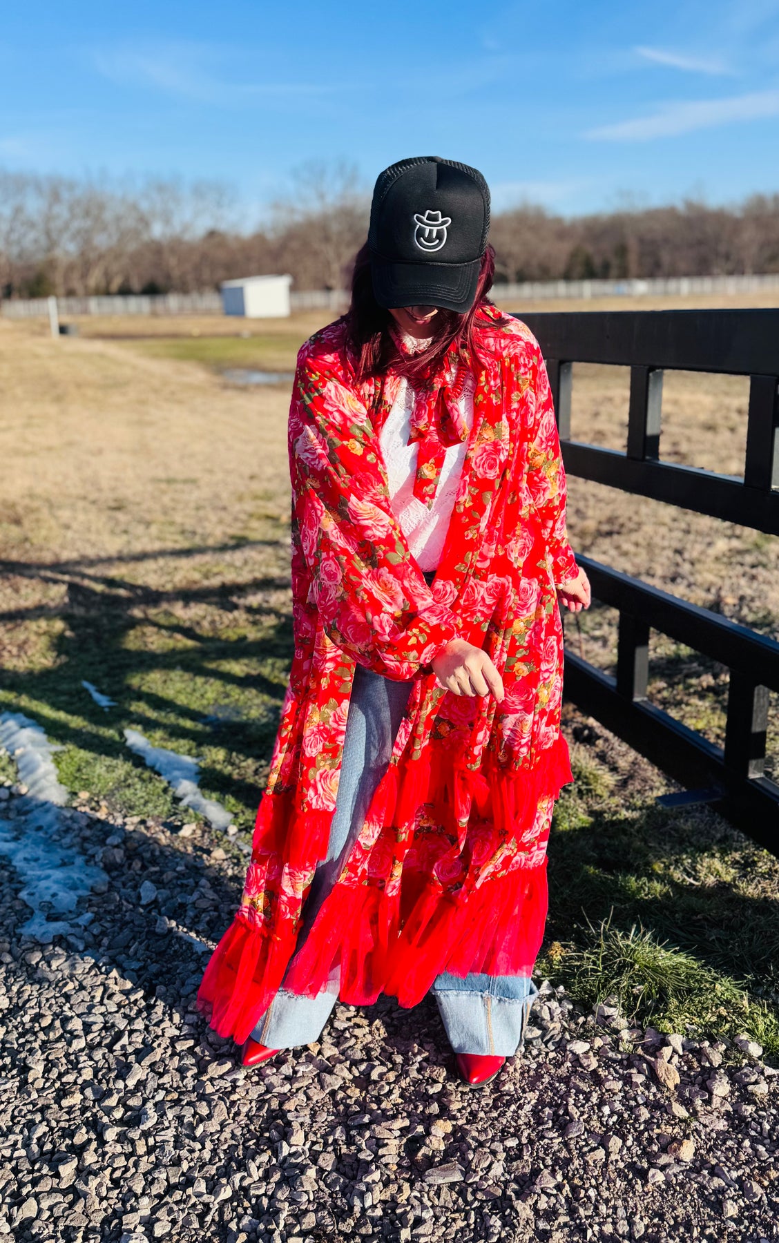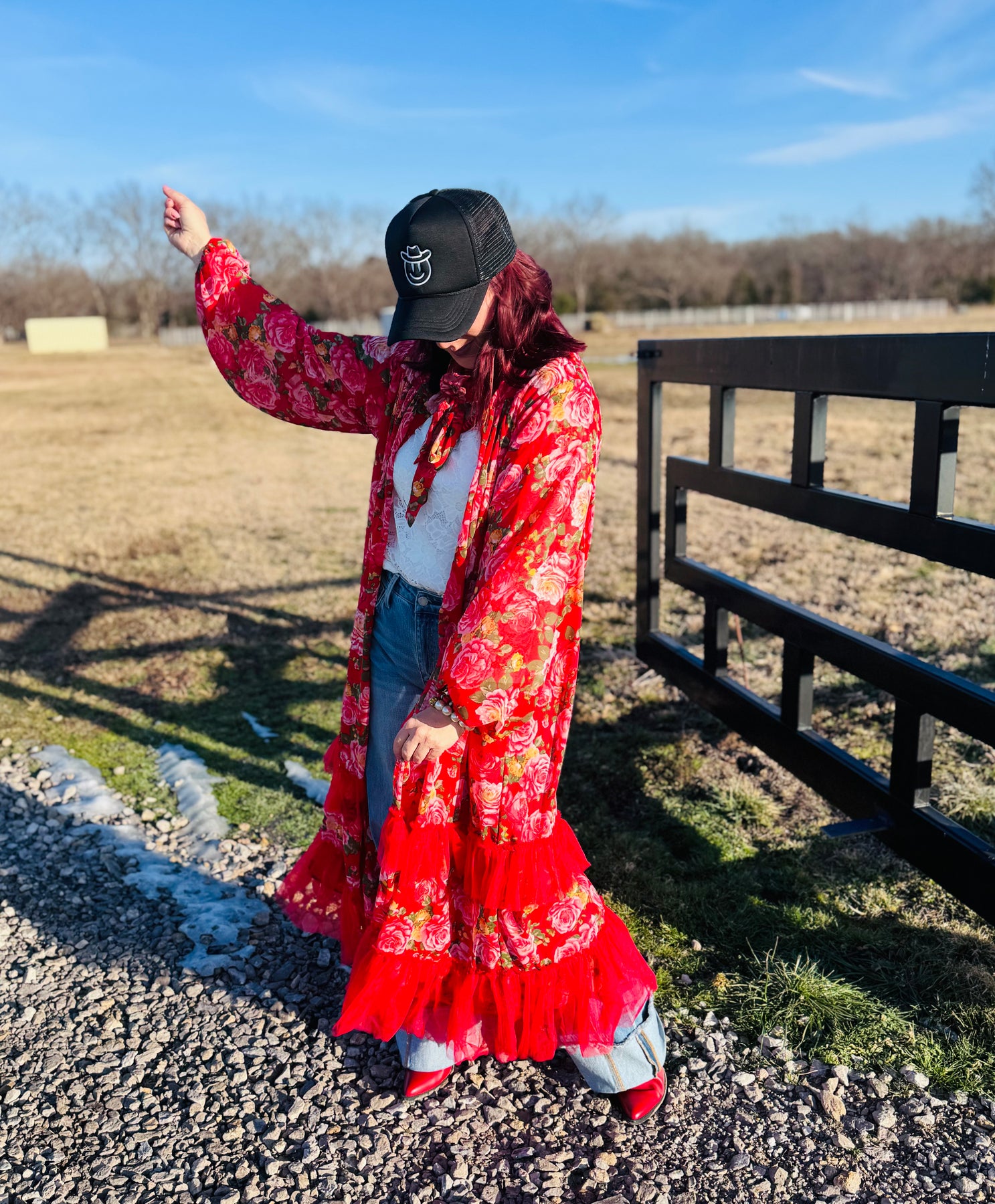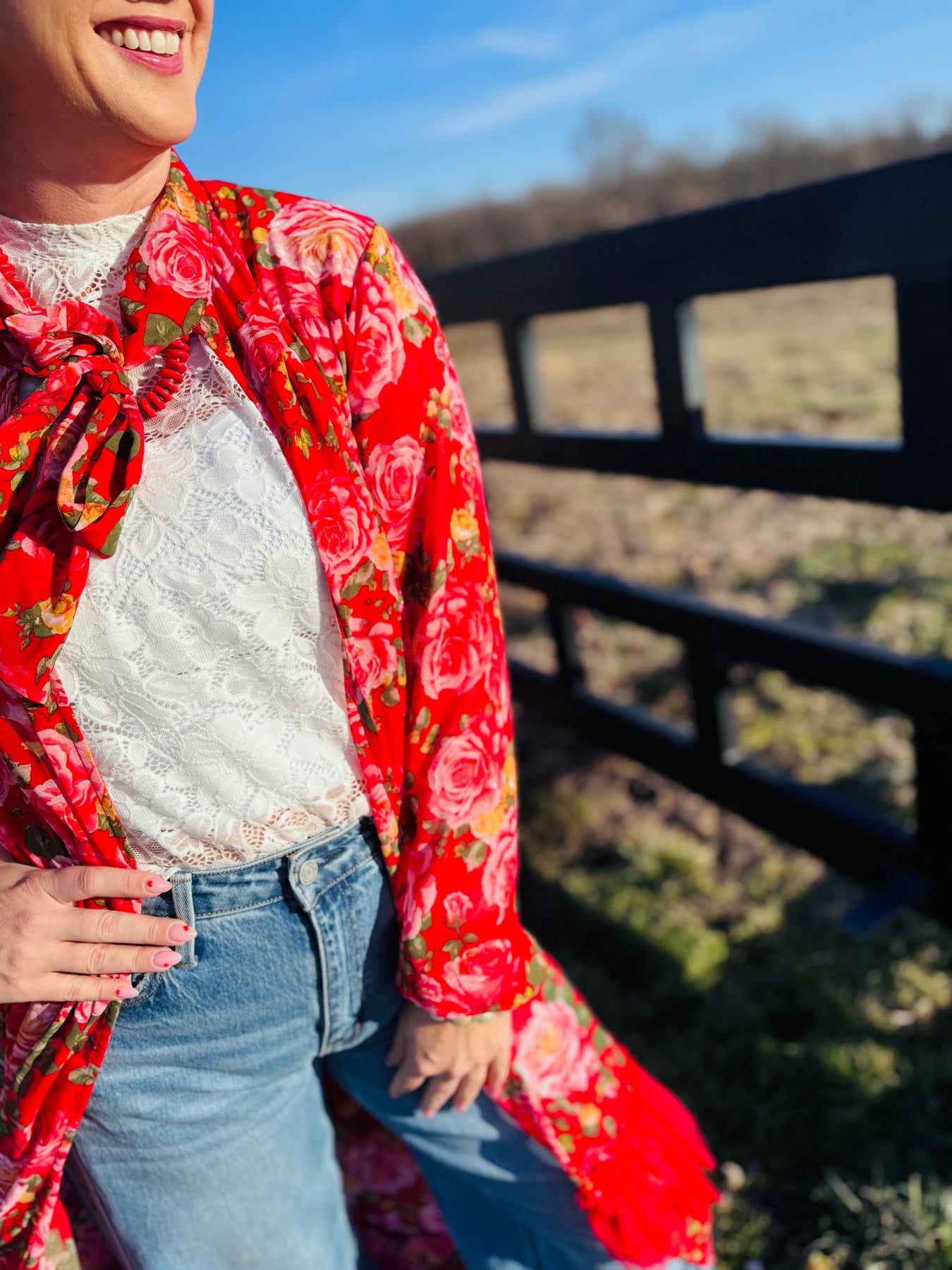 Red Rose Design Sheer Kimono with Red Lace Accents and Front Tie