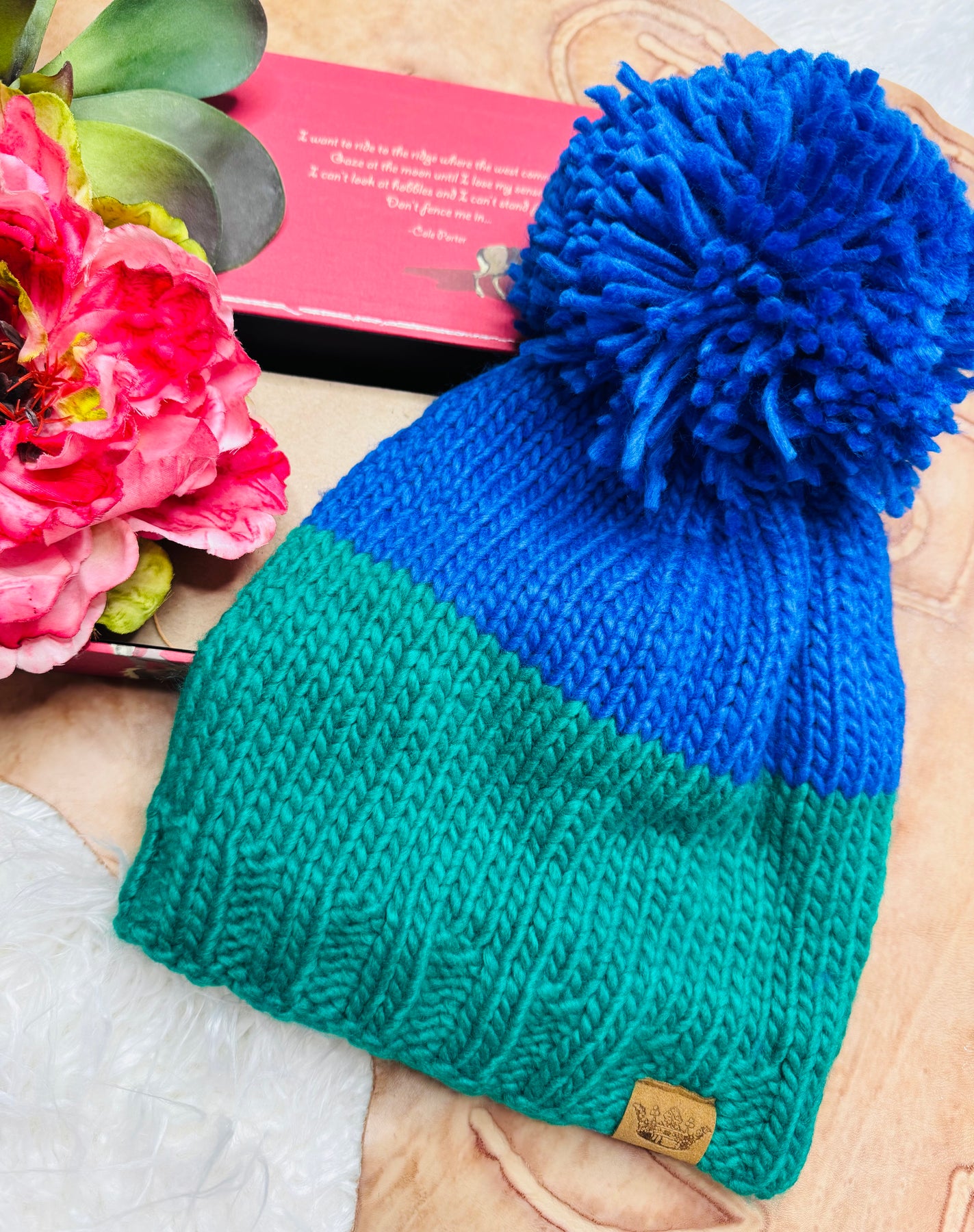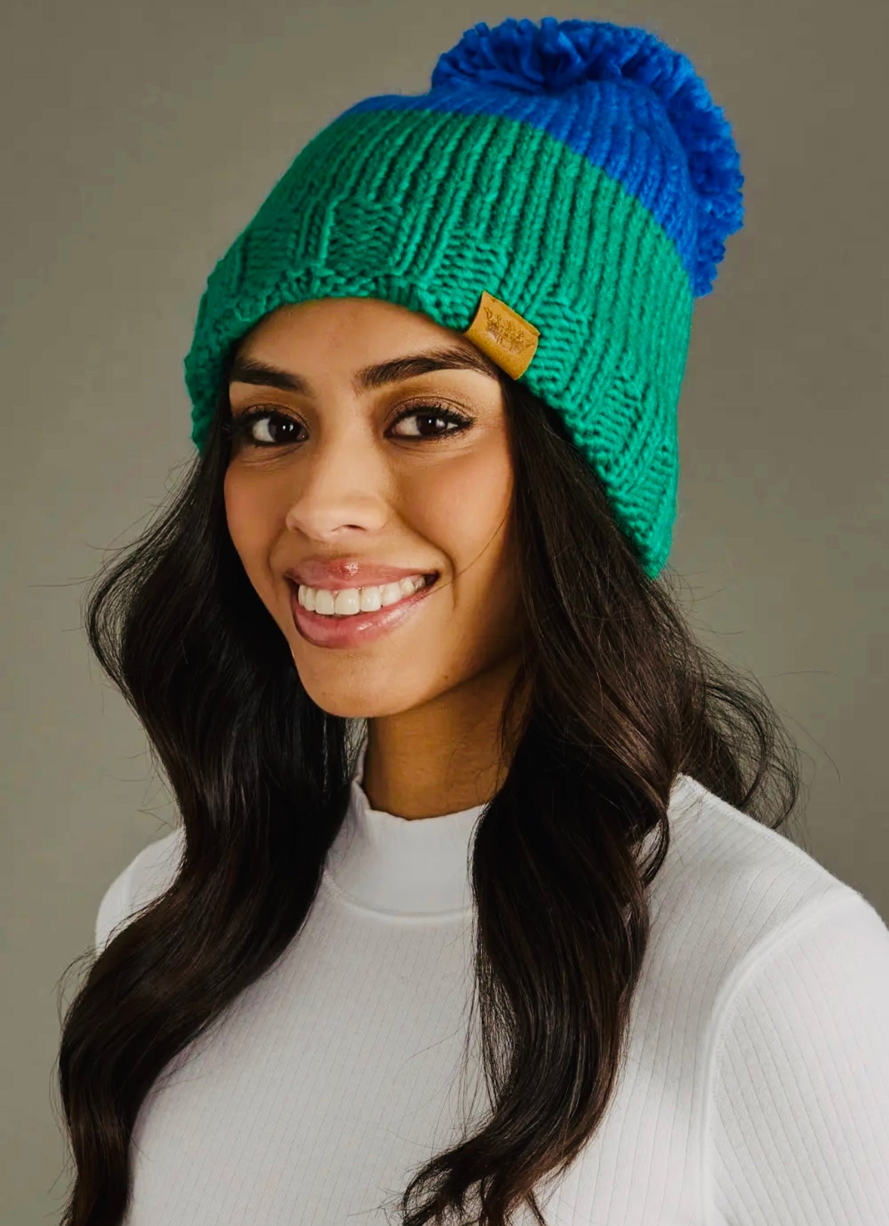 Blue & Green Color Block Knit Hat. Fleece Lined. Natural Faux Fur Pom Accent. 100% Acrylic.