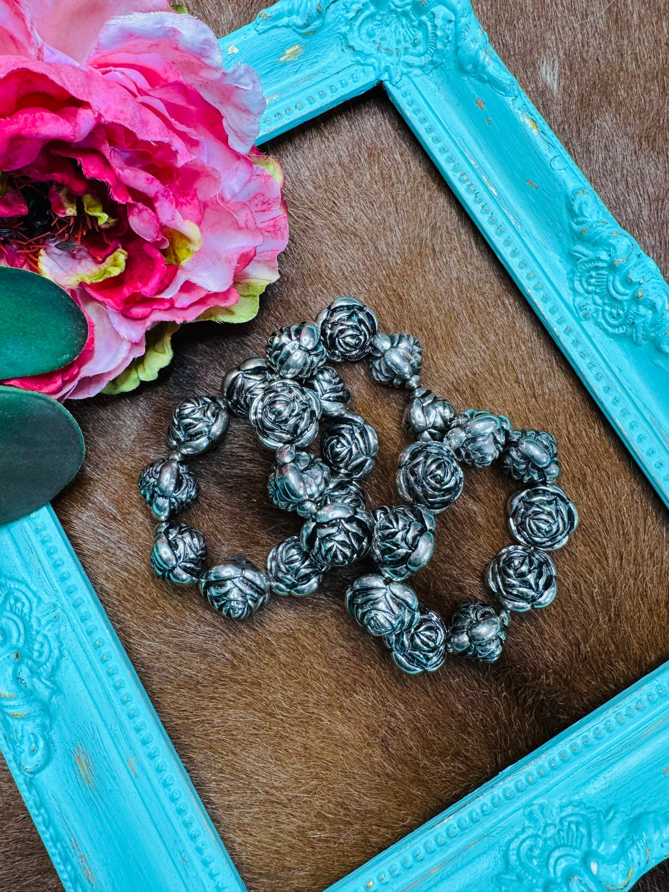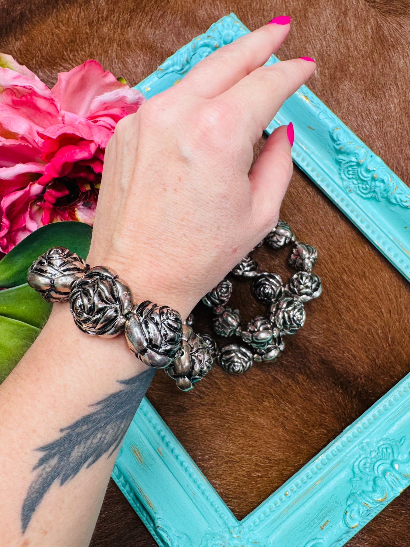 Large Antique Silver Stretch Rose Bracelet