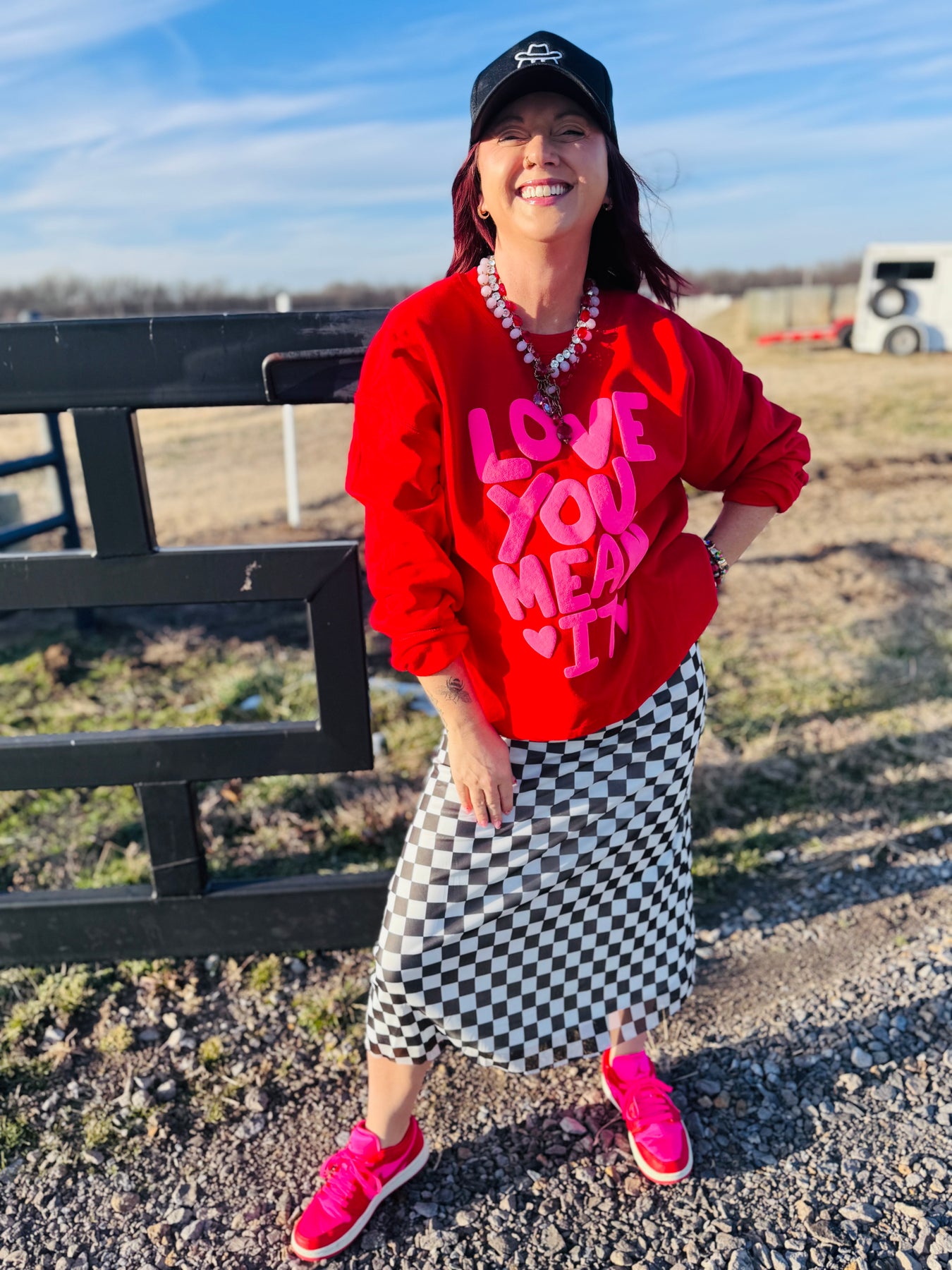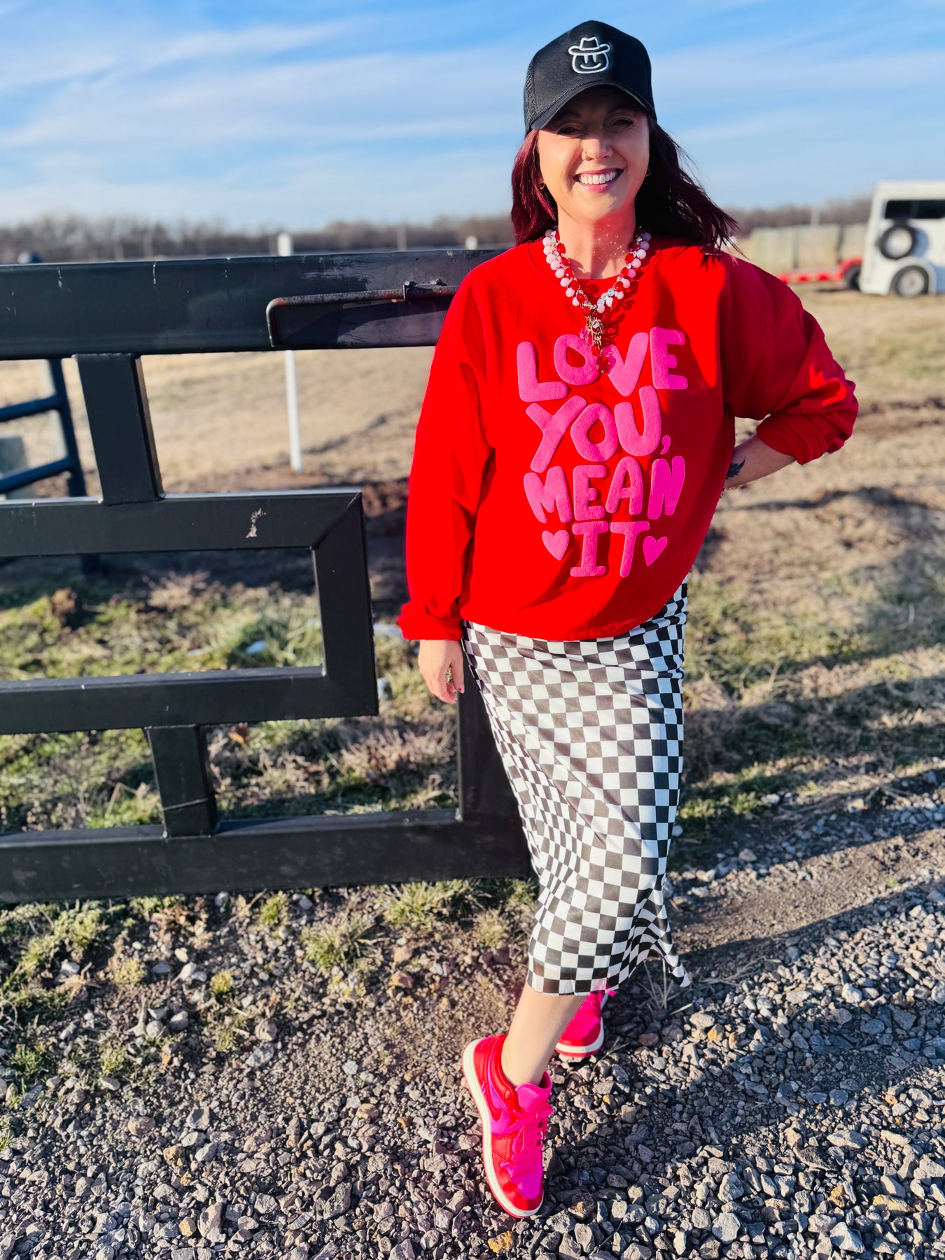 Love You, Mean It Puffy Wording on a Soft Red Crew Neck. Gildan Heavy Blend.