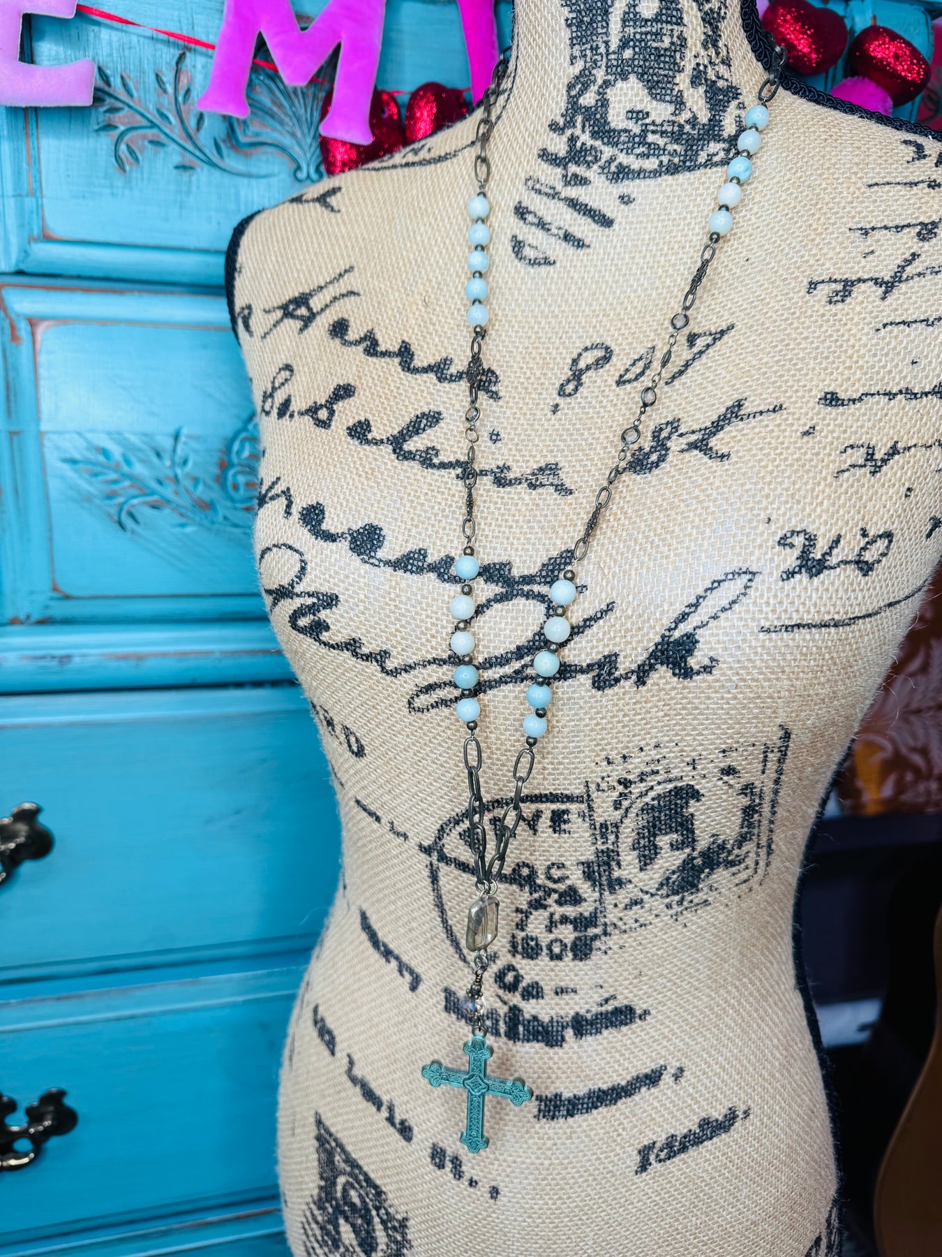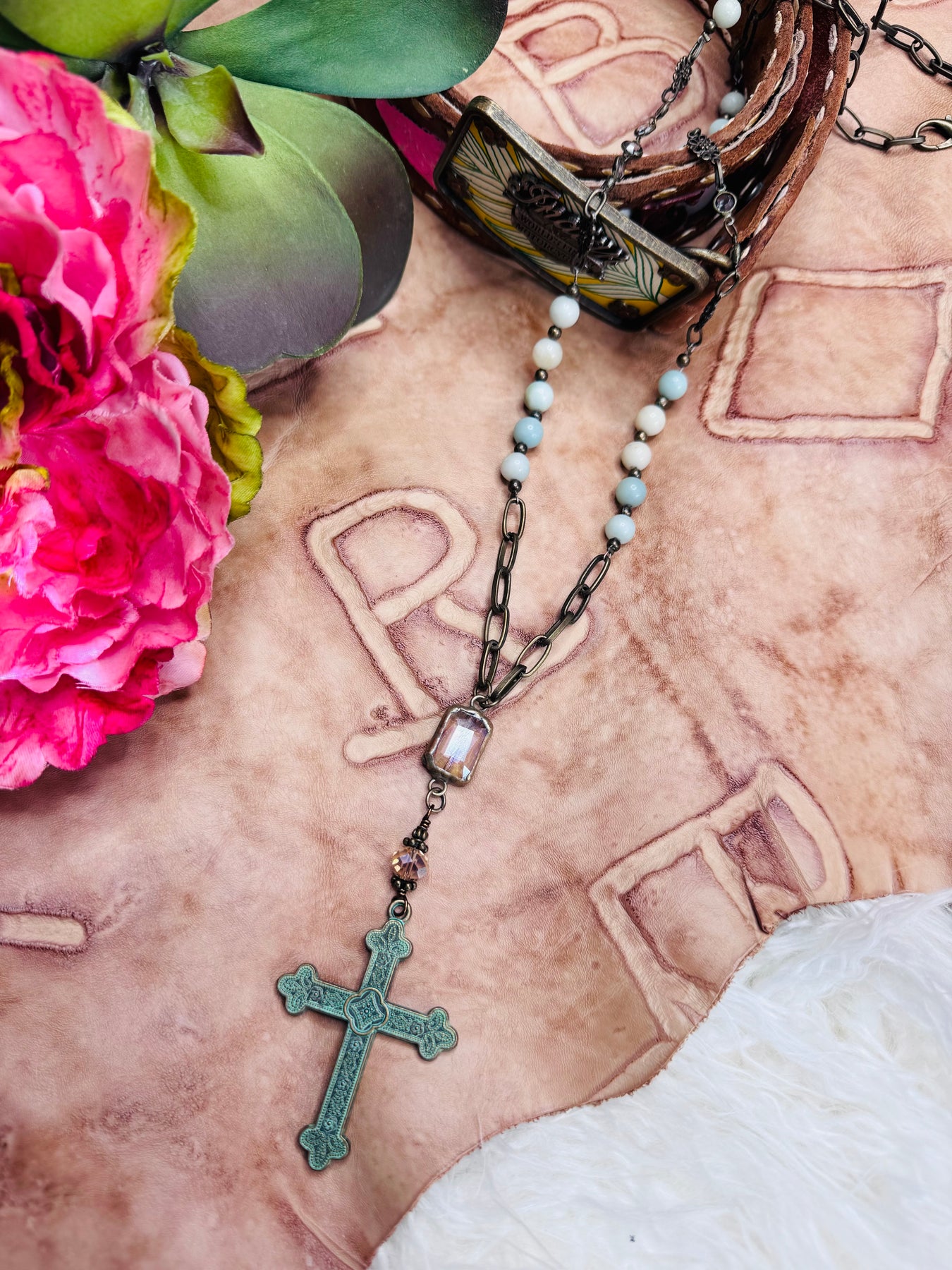 Green Cross Charm with Vintage Metal and Natural Beaded Necklace