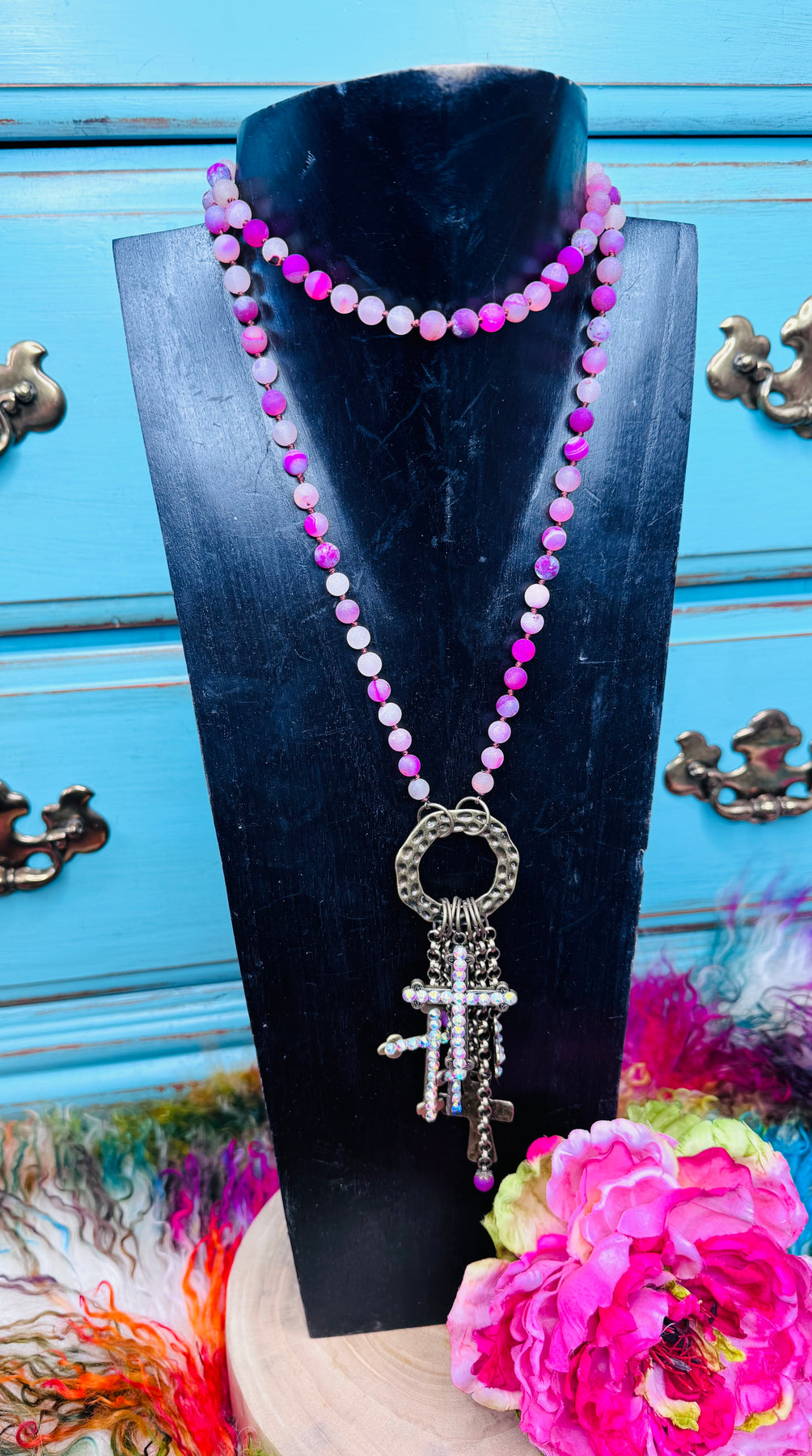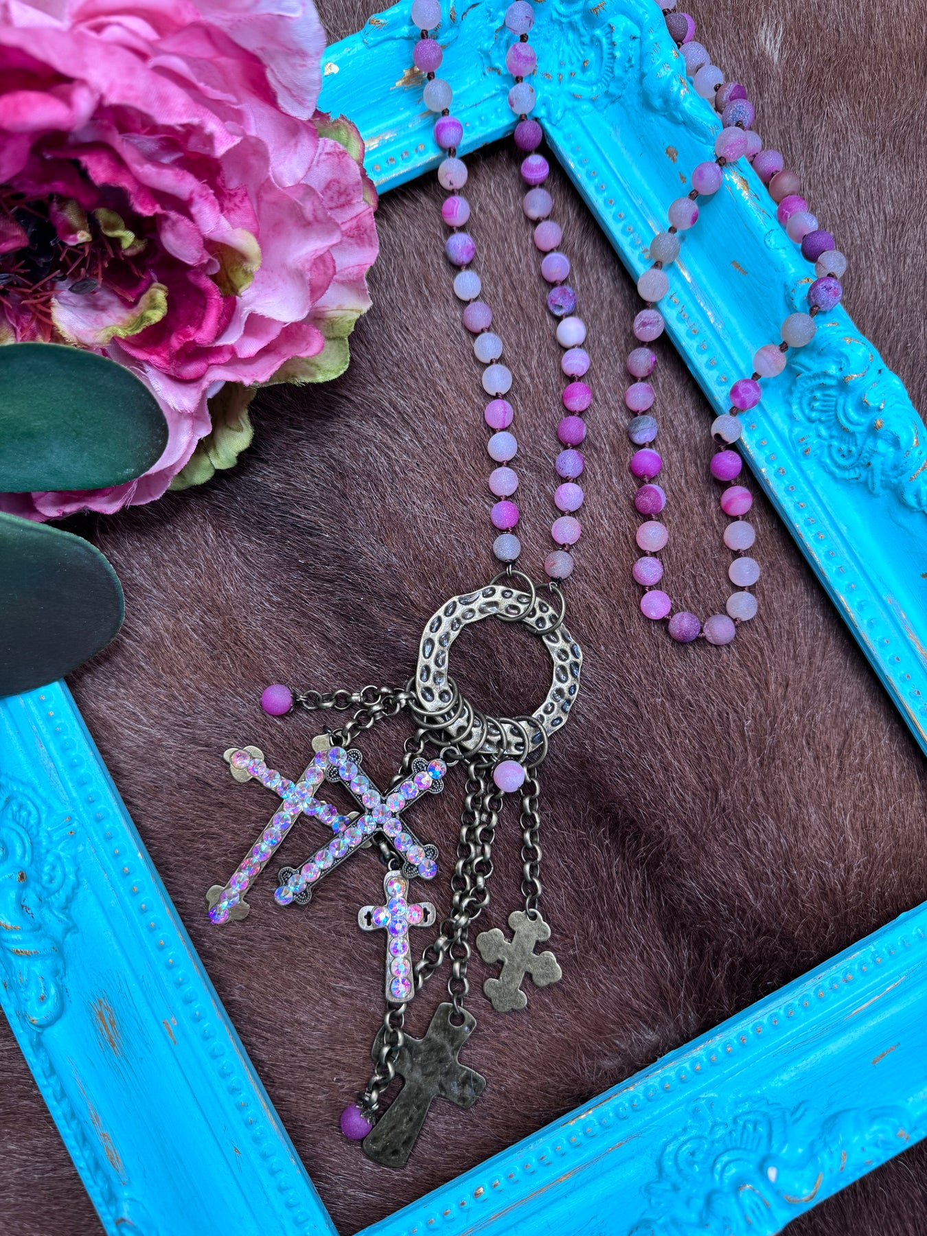 Pink Beaded Necklace with Mutli Rhinestone Crosses