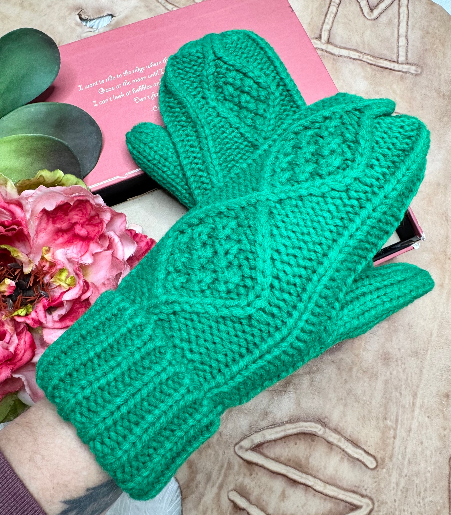 Bright Green Cable Knit Mittens. Fleece Lined. 100% Acrylic.