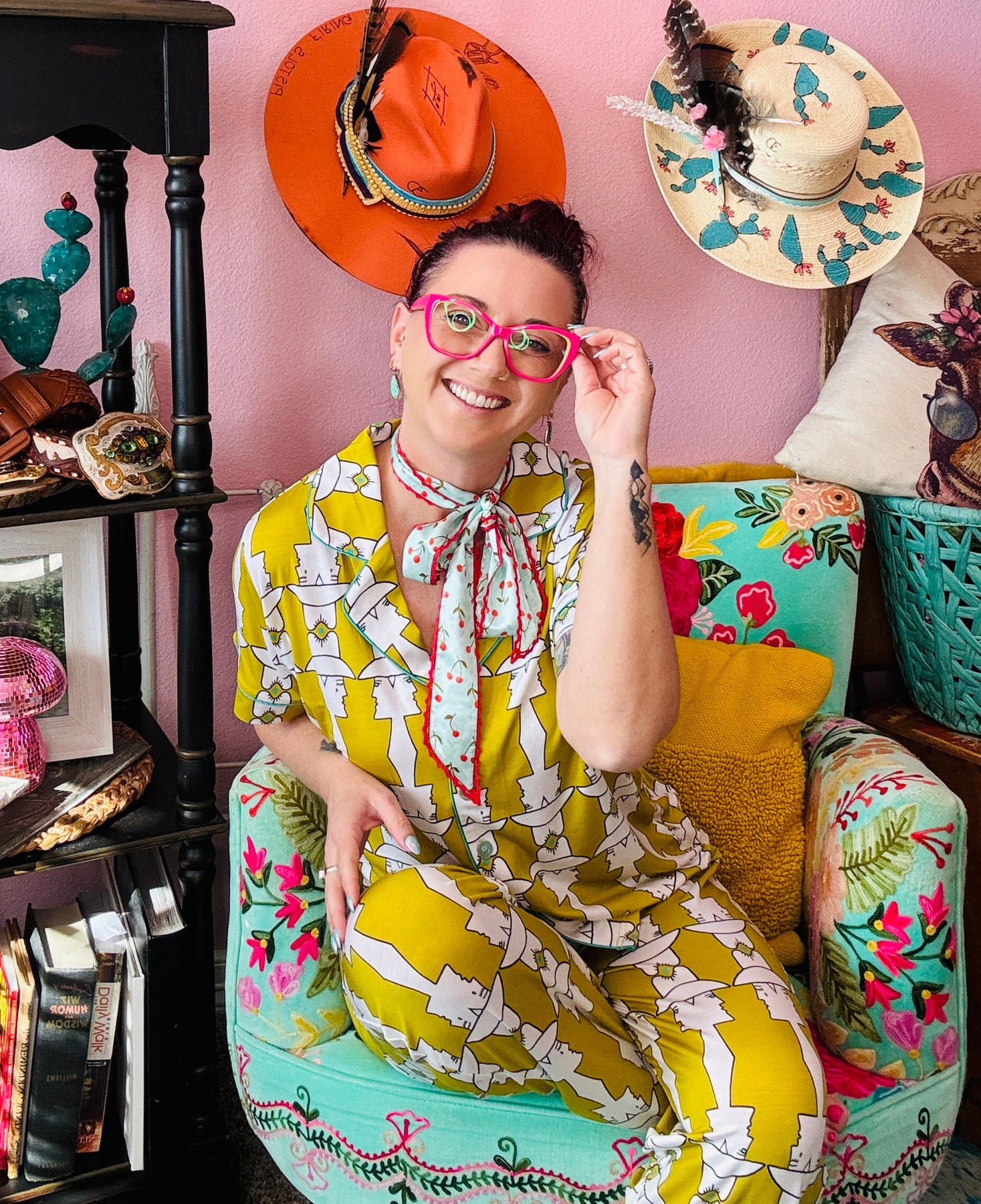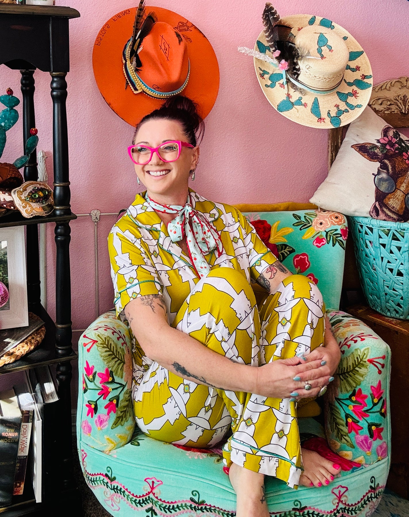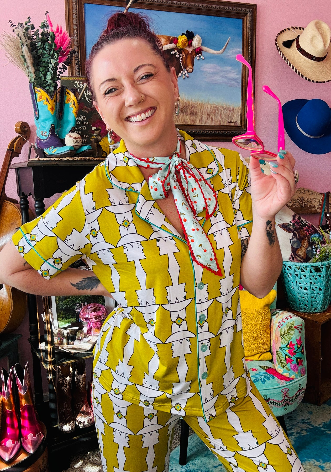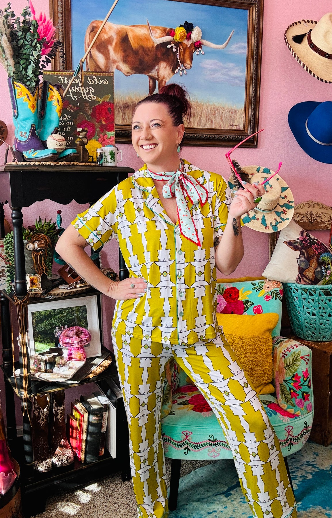 Allie Falcon Hand Drawn Designs. Our pajamas have become a cult favorite! Due to their buttery soft, temperature regulating fabric and hand-drawn designs, people can’t get enough! Our new Mod Maud print is a happy marriage of vintage and cowboy cool. *chefs kiss*