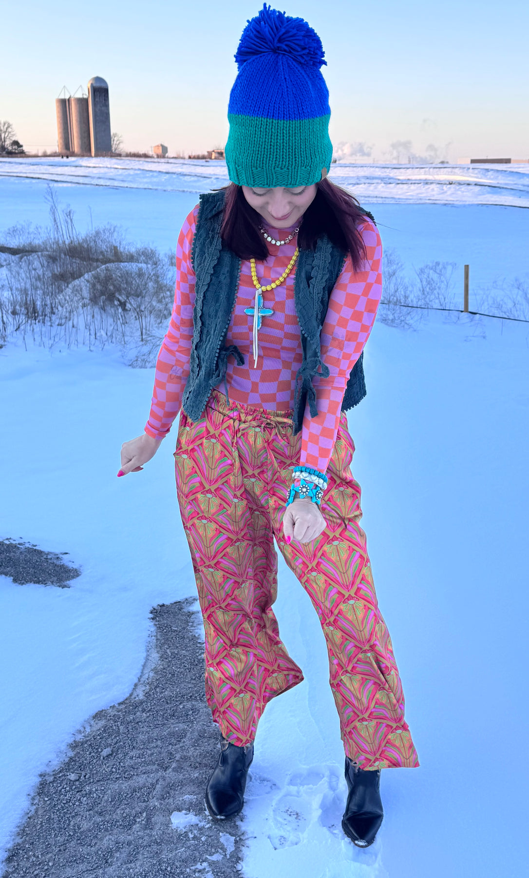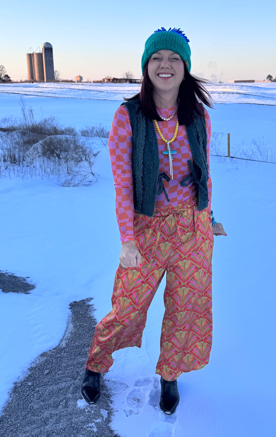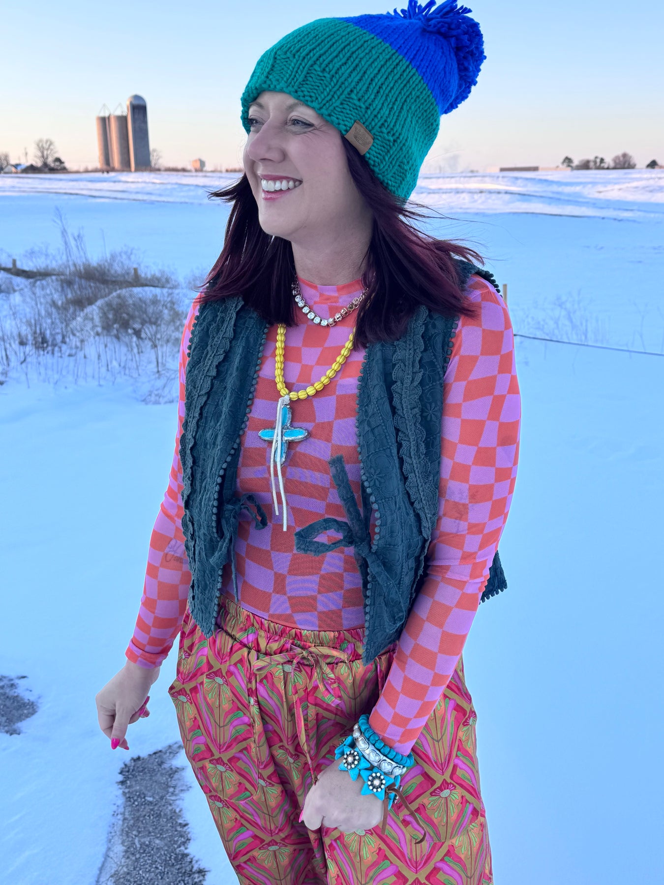 Pink & Orange Checkered Mesh Top
