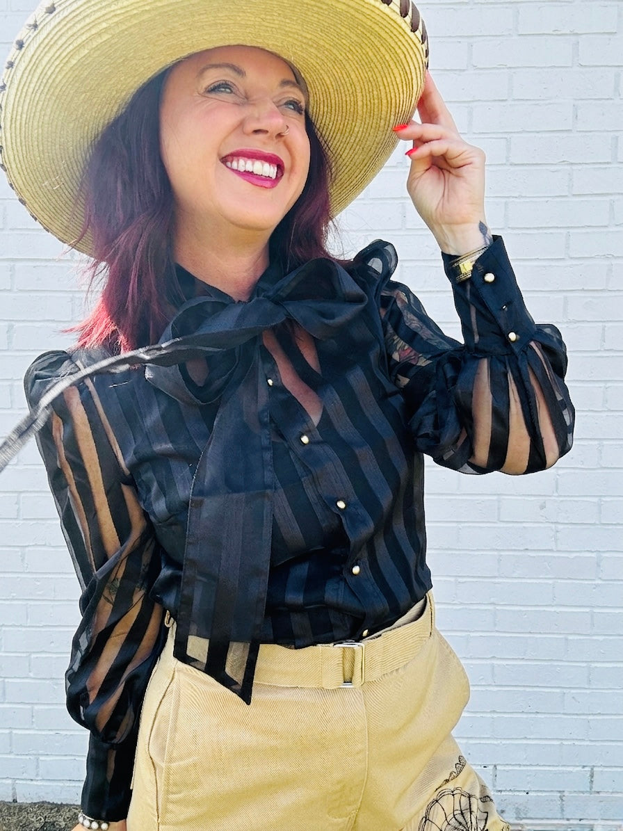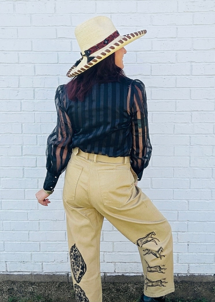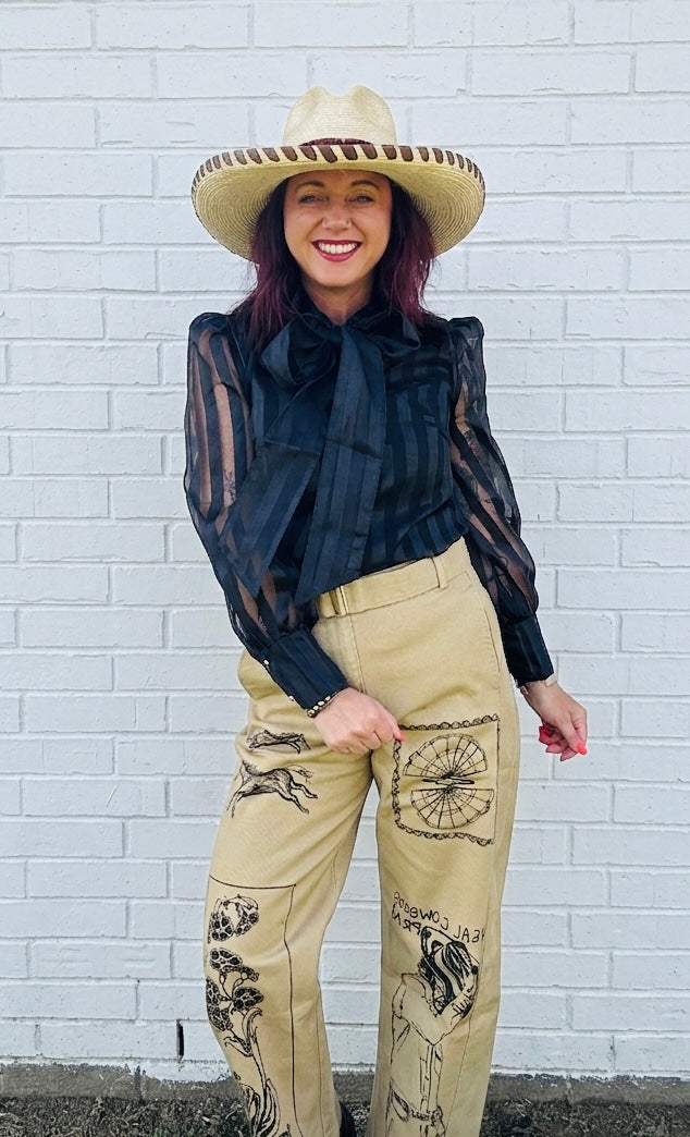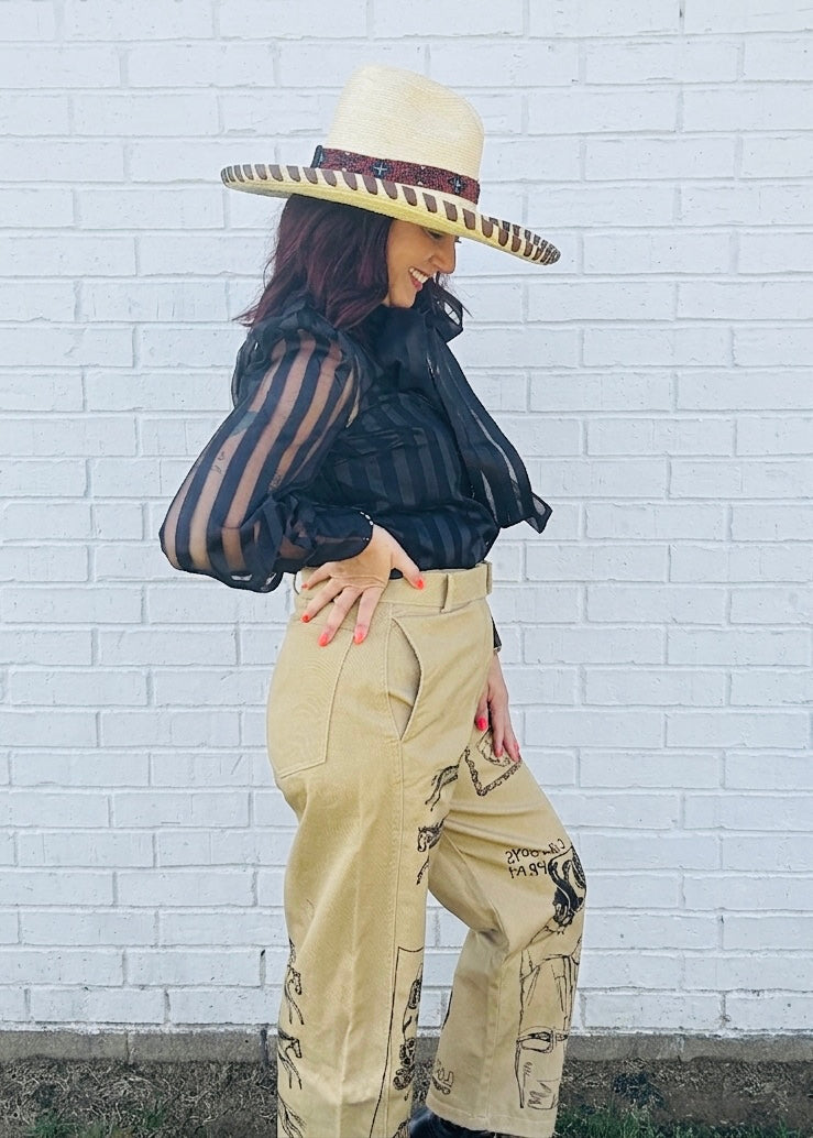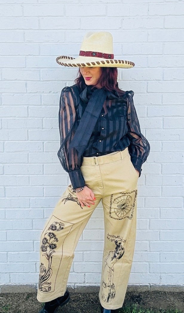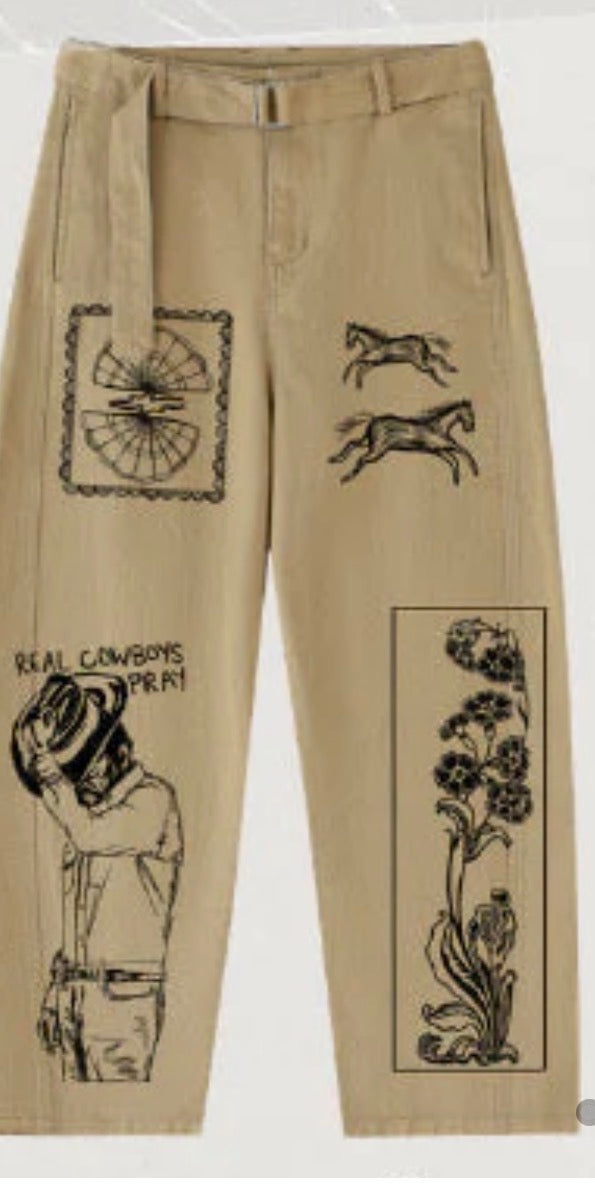 Lady the Brand Hand Drawn Designed Cowboys Pray Trouser. Slightly Barrel Chino Trouser.