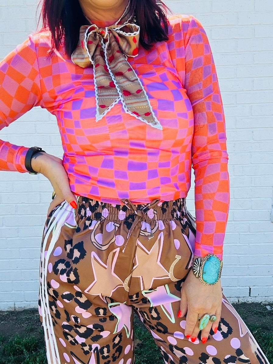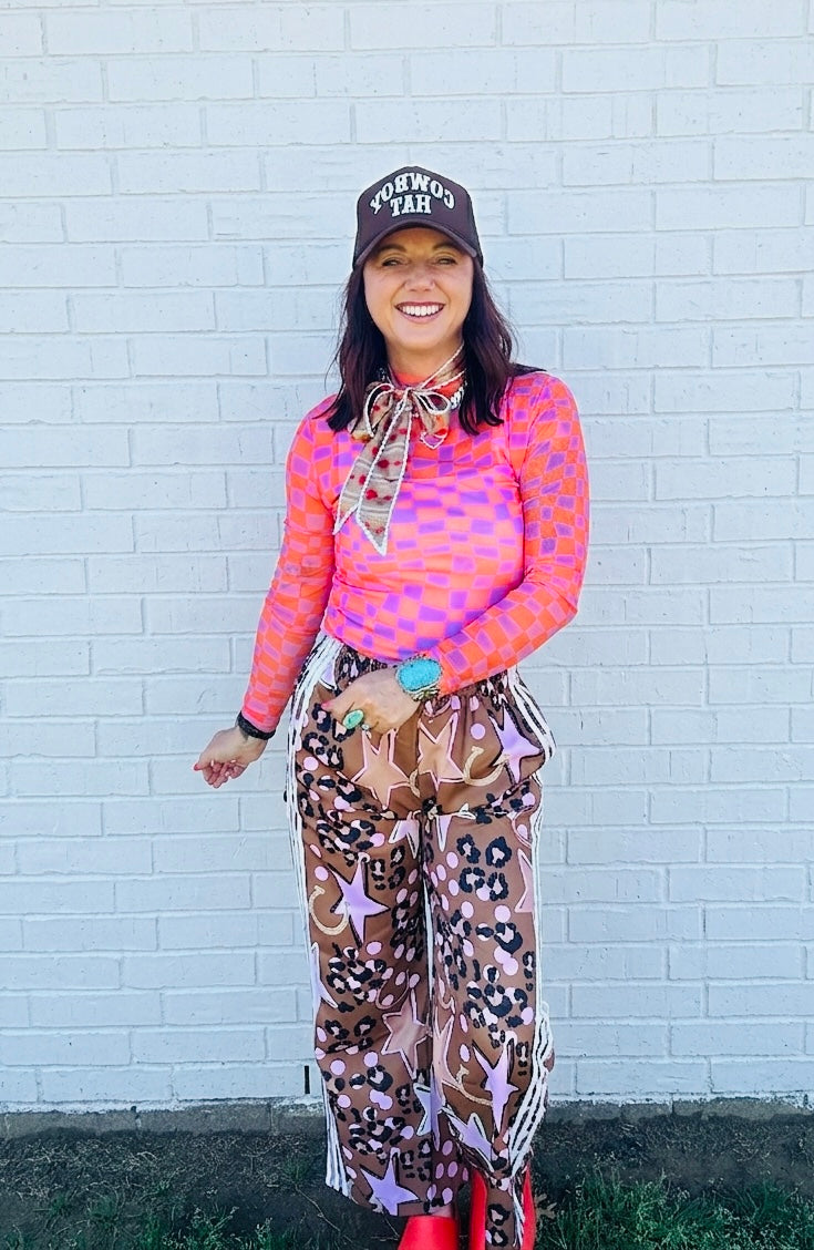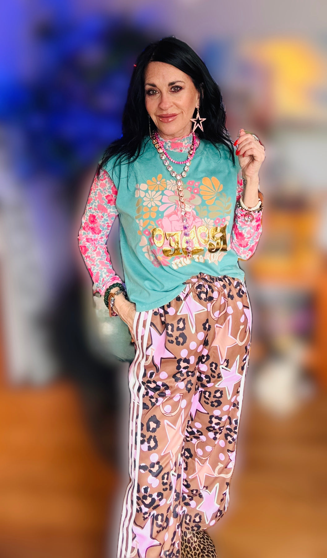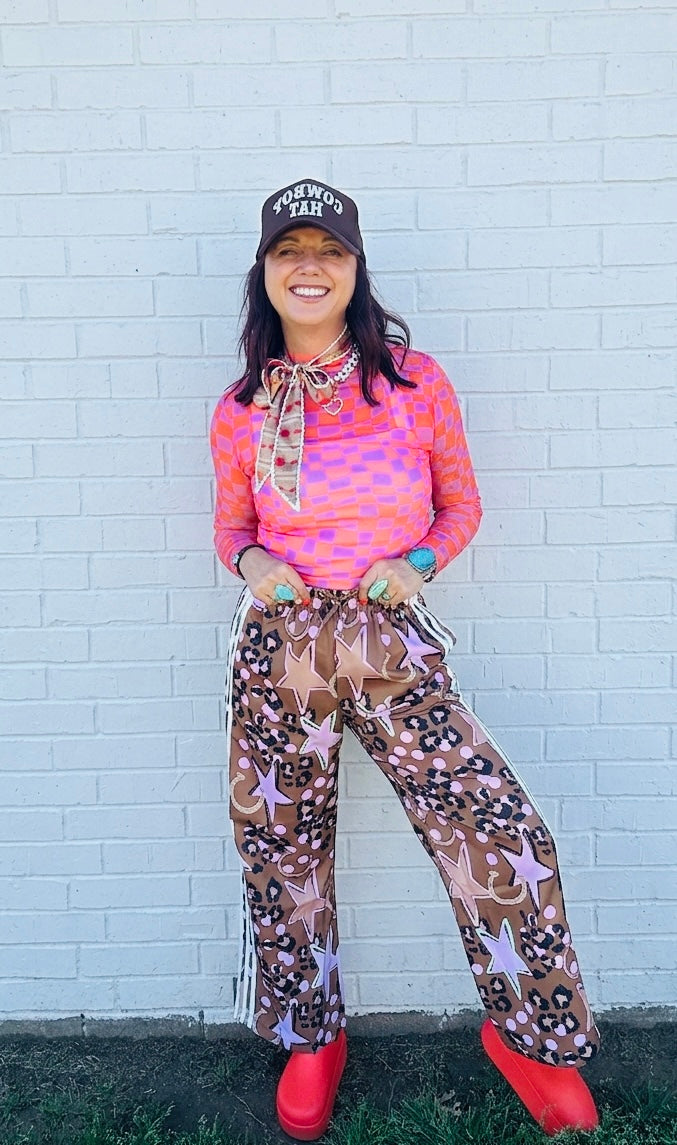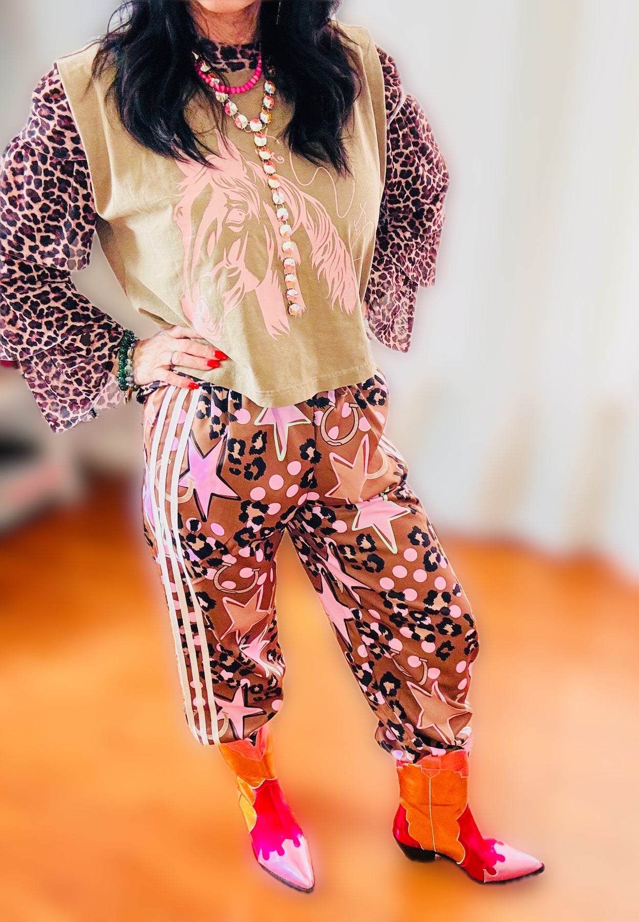 Star Leopard Pants. Elastic Waist and Faux Drawstring Bow.